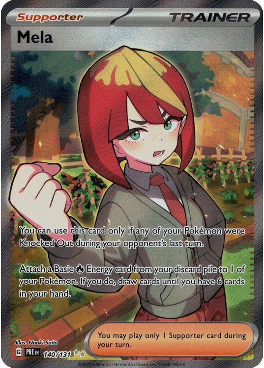 Mela er et Ultra Rare | Secret Rare pokemon kort fra SV08.5 Prismatic Evolutions serien og har nummer 140/131.