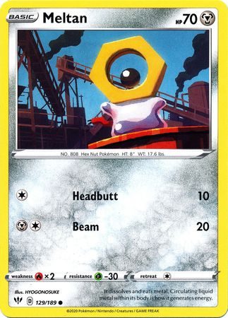 Meltan er et Common pokemon kort fra SWSH Darkness Ablaze serien og har nummer 129/189.