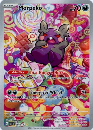 Morpeko er et Illustration Rare | Secret Rare pokemon kort fra SV04 Paradox Rift serien og har nummer 206/182.