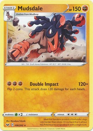 Mudsdale er et Rare pokemon kort fra Sword & Shield serien og har nummer 106/202.