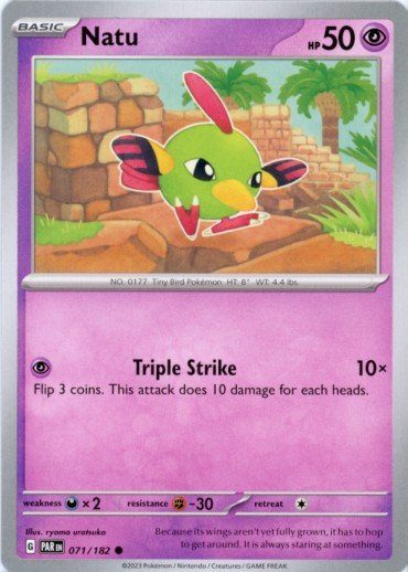 Natu er et Common pokemon kort fra SV04 Paradox Rift serien og har nummer 71/182.