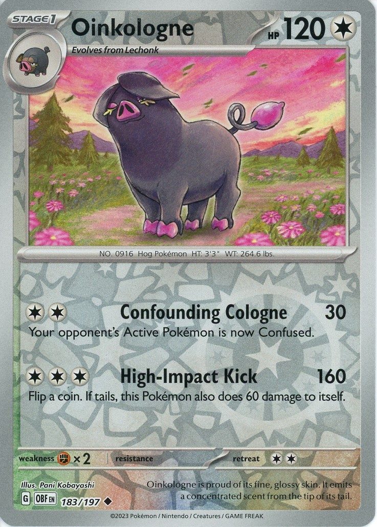 Oinkologne er et Uncommon pokemon kort fra SV03 Obsidian Flames serien og har nummer 183/197.