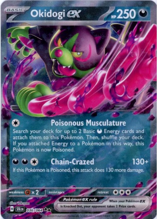 Okidogi ex er et Double Rare | Super Rare ex (SV) pokemon kort fra SV06.5 Shrouded Fable serien og har nummer 36/064.
