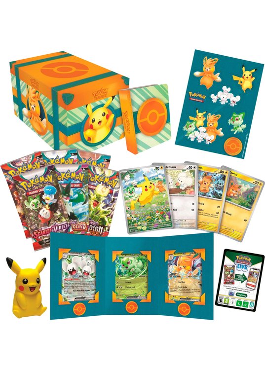 A world of adventure awaits Pokémon Trainers in the Paldea region! Gear up for battle with a big handful of ready-to-play promo cards featuring cute yet feisty Pokémon, then open up a set of booster packs to find even more friends! Along the way, you’ll get to decorate your gear with tech stickers, show off your collection with a mini portfolio, and give a squishy toy Pikachu a squeeze!