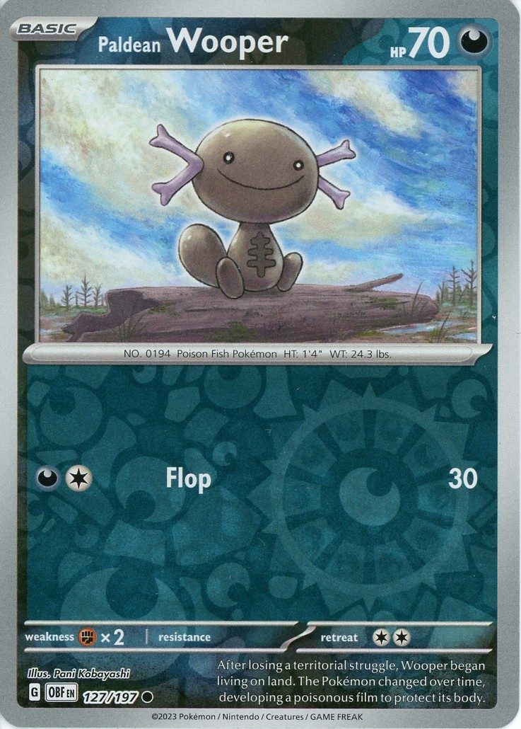 Paldean Wooper er et Common pokemon kort fra SV03 Obsidian Flames serien og har nummer 127/197.