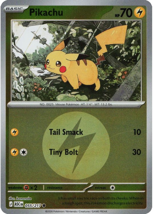 Pikachu er et Common pokemon kort fra ME02.5 Ascended Heroes serien og har nummer 55/217.