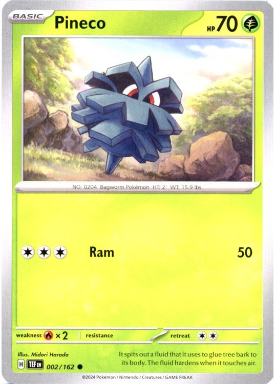 Pineco er et Common pokemon kort fra SV05 Temporal Forces serien og har nummer 2/162.