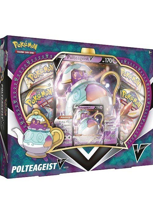 Denne seje pokemon V box fra SWSH Rebel Clash indeholder både 4 booster pakker og Polteageist V – SWSH021.