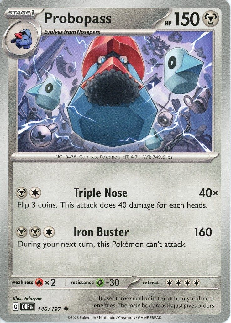 Probopass er et Uncommon pokemon kort fra SV03 Obsidian Flames serien og har nummer 146/197.