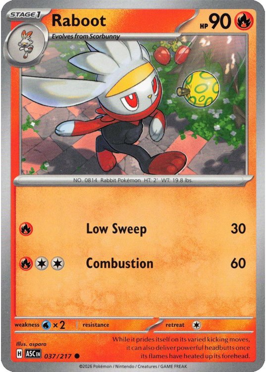 Raboot er et Common pokemon kort fra ME02.5 Ascended Heroes serien og har nummer 37/217.