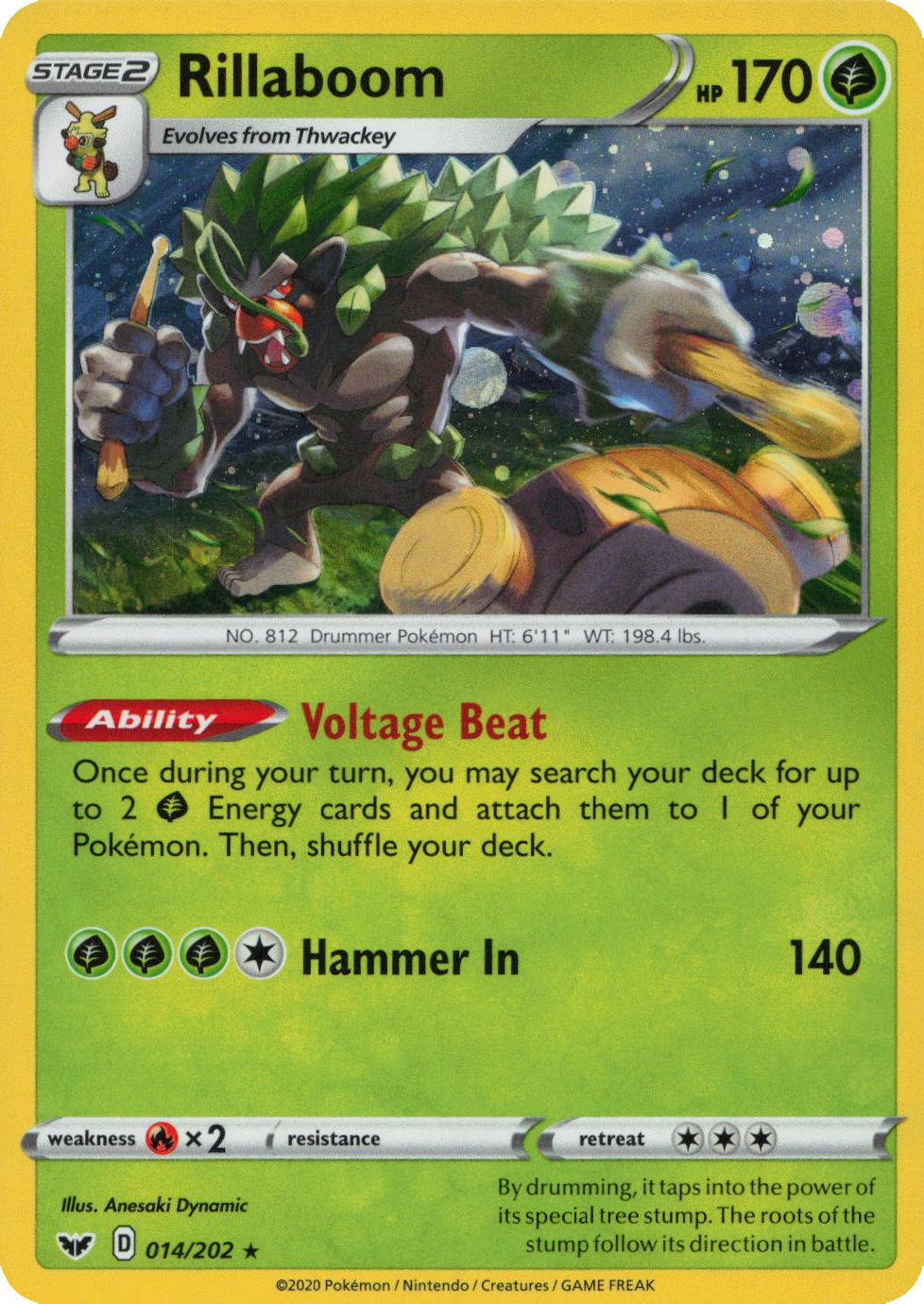 Du køber her en alternativ udgave af et pokemonkort, nemlig Rillaboom – 014/202 – Cosmos Holo.