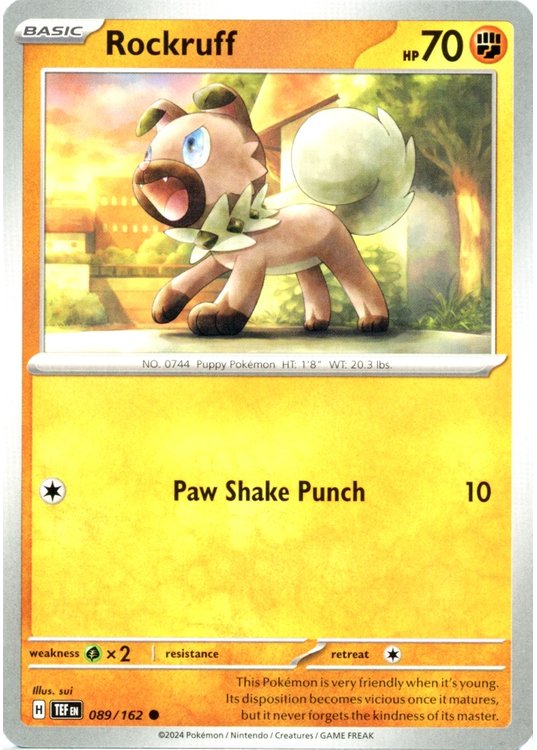 Rockruff er et Common pokemon kort fra SV05 Temporal Forces serien og har nummer 89/162.