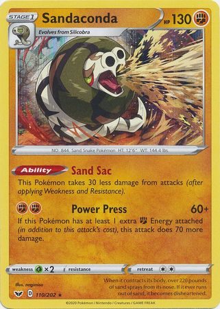 Sandaconda er et Rare Holo Holo pokemon kort fra Sword & Shield serien og har nummer 110/202.
