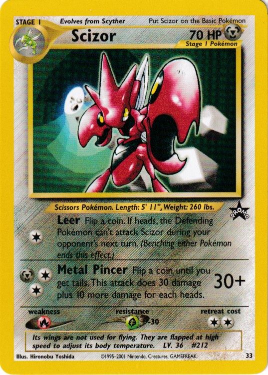 Flip a coin. If heads, the Defending Pokémon can’t attack Scizor during your opponent’s next turn. (Benching either Pokémon ends this effect.)