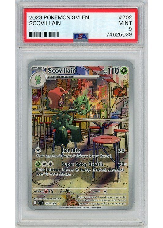 Du køber her et PSA 9 Scovillain pokemon kort fra Scarlet & Violet serinen.