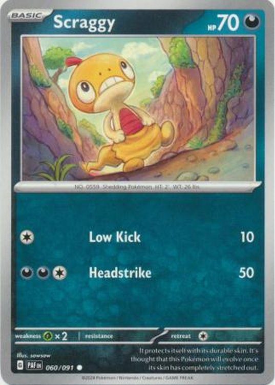 Scraggy er et Common pokemon kort fra SV04.5 Paldean Fates serien og har nummer 60/091.