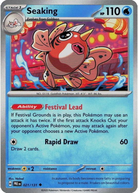 Seaking er et Uncommon pokemon kort fra SV08.5 Prismatic Evolutions serien og har nummer 21/131.
