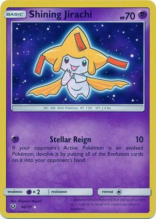 Shining Jirachi er et Ultra Rare kort fra S&M Shining Legends serien og har nummer 42/73.