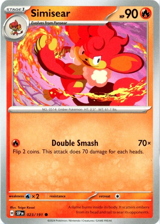 Simisear er et Common pokemon kort fra SV08 Surging Sparks serien og har nummer 23/191.