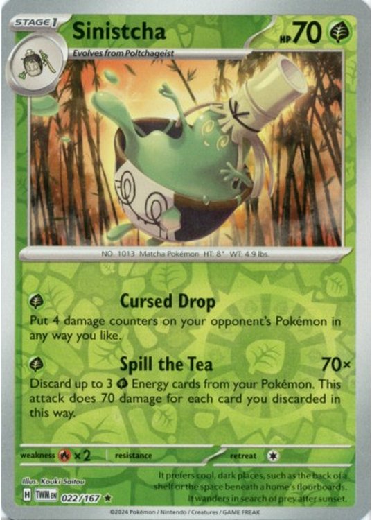 Sinistcha er et Rare Holo Holo pokemon kort fra SV06 Twilight Masquerade serien og har nummer 22/167.