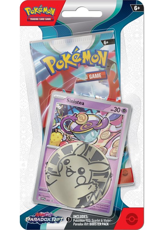 Denne seje 1-styk blister pakke fra SV04 Paradox Rift indeholder både 1 pokemon booster pakke, Sinistea – SVP062 og 1 stor sej Pikachu mønt.