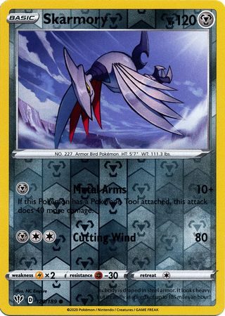 Skarmory er et Common pokemon kort fra SWSH Darkness Ablaze serien og har nummer 120/189.