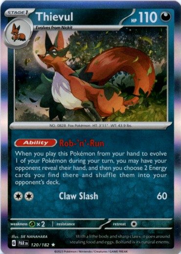 Thievul er et Rare Holo pokemon kort fra SV04 Paradox Rift serien og har nummer 120/182.