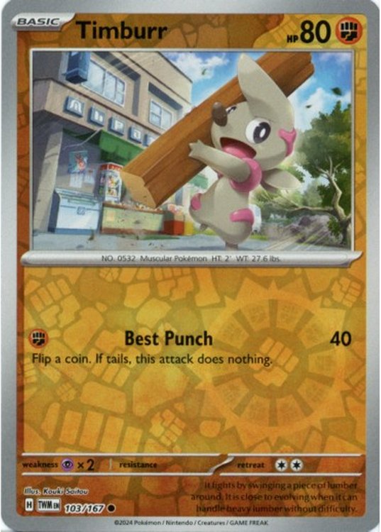 Timburr er et Common pokemon kort fra SV06 Twilight Masquerade serien og har nummer 103/167.