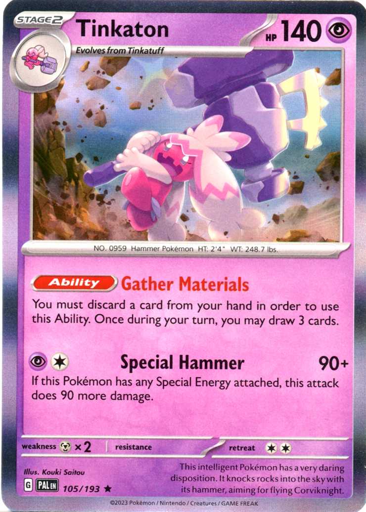 Tinkaton er et Rare Holo Holo pokemon kort fra SV02 Paldea Evolved serien og har nummer 105/193.