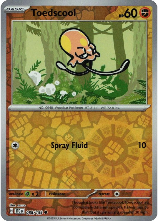Toedscool er et Common pokemon kort fra SV09 Journey Together serien og har nummer 88/159.