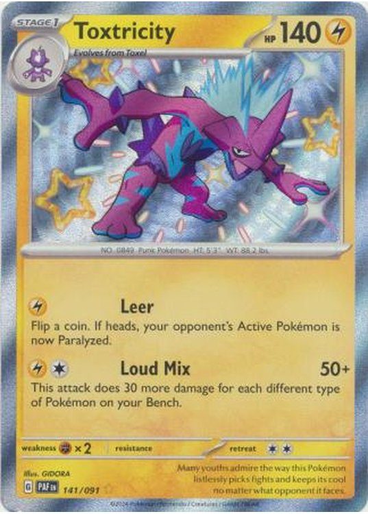 Toxtricity er et Shiny Rare | Super Rare pokemon kort fra SV04.5 Paldean Fates serien og har nummer 141/091.