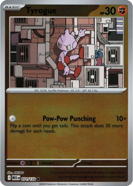 Tyrogue er et Common pokemon kort fra ME01 Mega Evolution serien og har nummer 71/132.