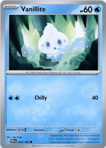 Vanillite er et Common pokemon kort fra SV04 Paradox Rift serien og har nummer 43/182.
