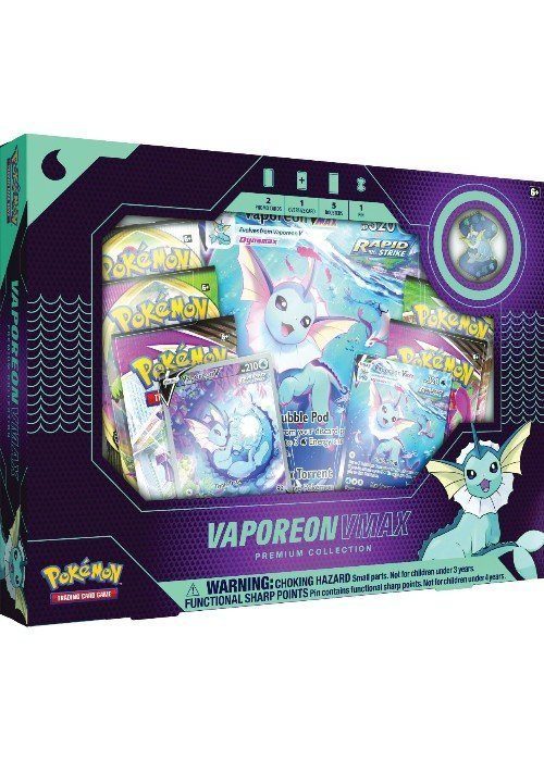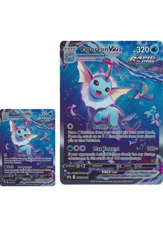 With power as vast as the sea, Vaporeon VMAX is a force of enormous strength and depth! This watery Pokémon VMAX delivers a steady stream of power when you need it. All the strength, all the relentless force of Water-type Pokémon combines in one outstanding Evolution, a Pokémon that brings oceans of power to any battle. Roll like the waves and add seaborne treasures to your collection with Vaporeon VMAX!