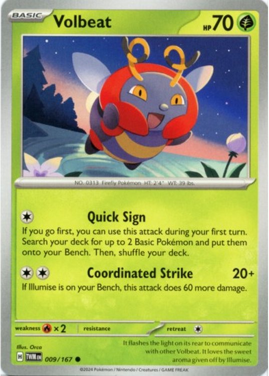 Volbeat er et Common pokemon kort fra SV06 Twilight Masquerade serien og har nummer 9/167.