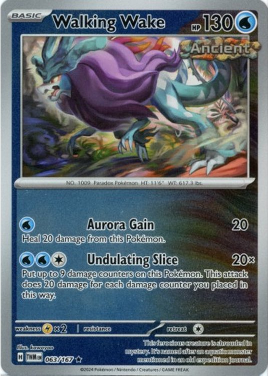 Walking Wake er et Rare Holo Holo pokemon kort fra SV06 Twilight Masquerade serien og har nummer 63/167.