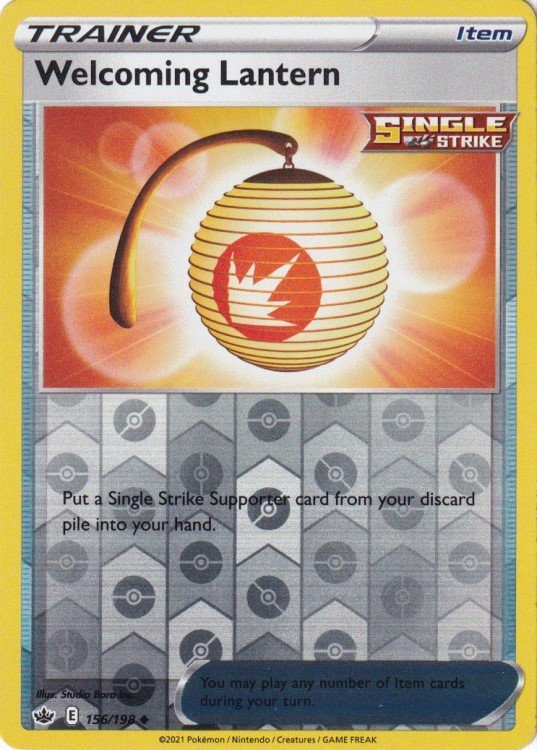 Welcoming Lantern er et Uncommon pokemon kort fra SWSH Chilling Reign serien og har nummer 156/198.