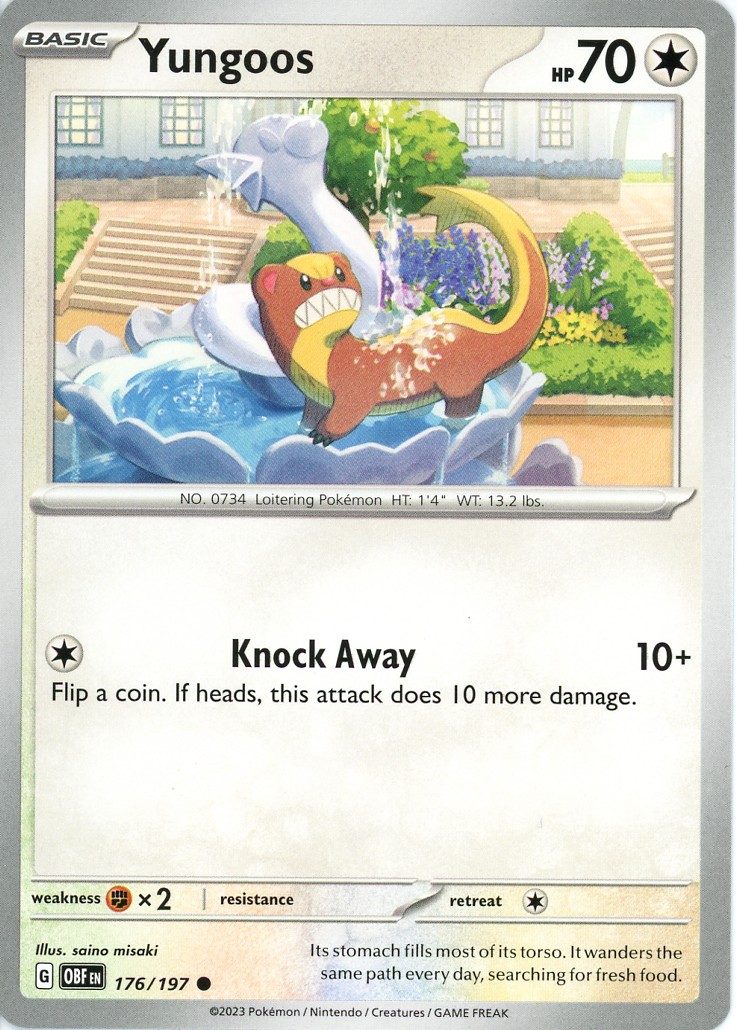 Yungoos er et Common pokemon kort fra SV03 Obsidian Flames serien og har nummer 176/197.