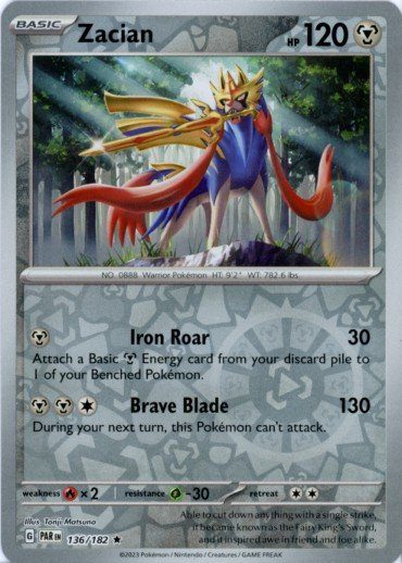Zacian er et Rare Holo pokemon kort fra SV04 Paradox Rift serien og har nummer 136/182.